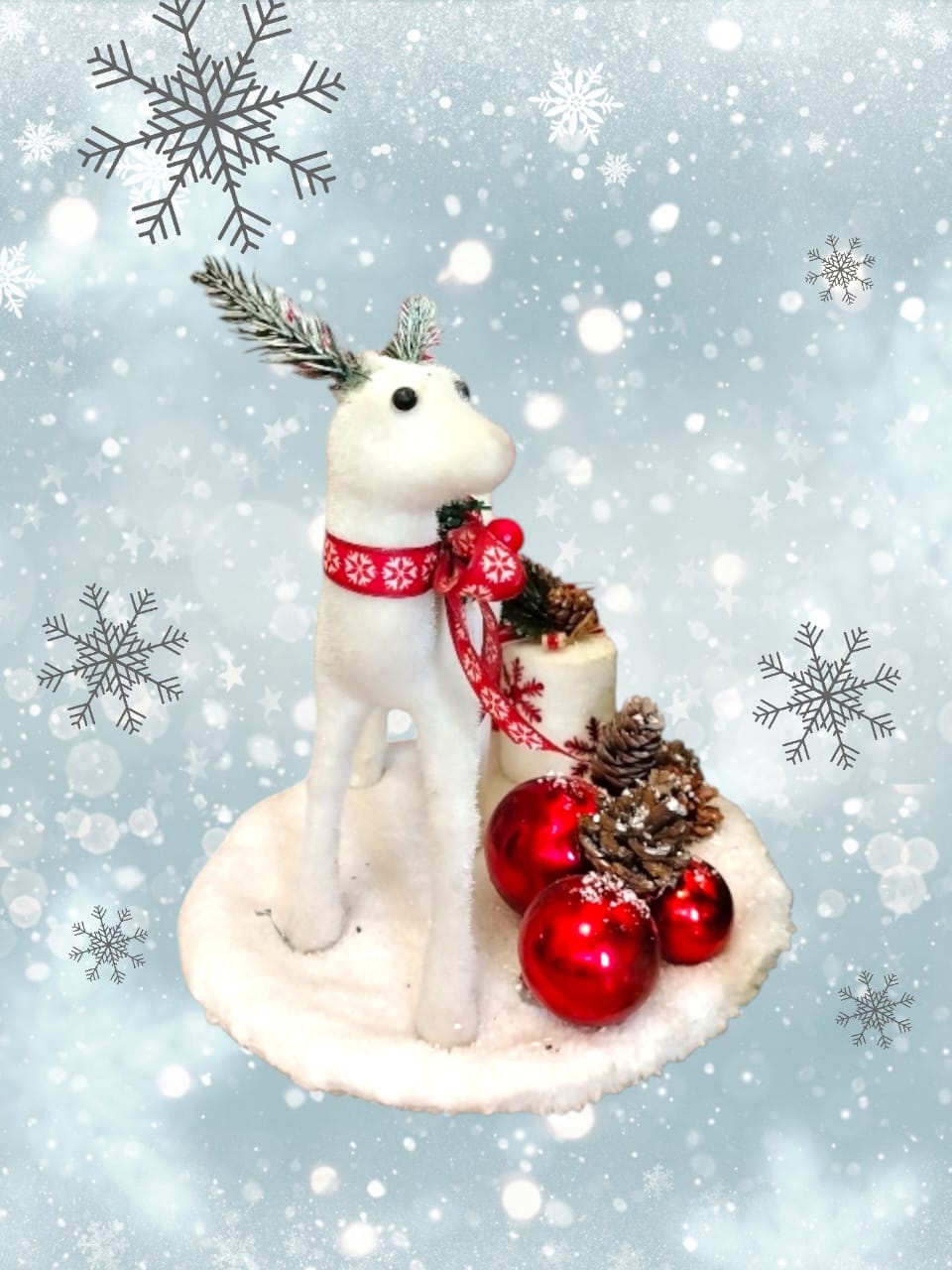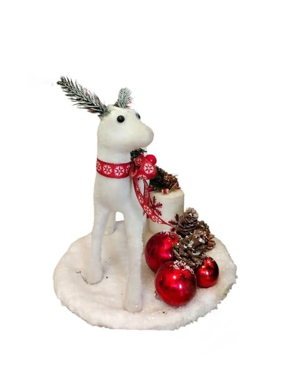 Larger white reindeer with pine cone and red round ornaments  size:27*25cm