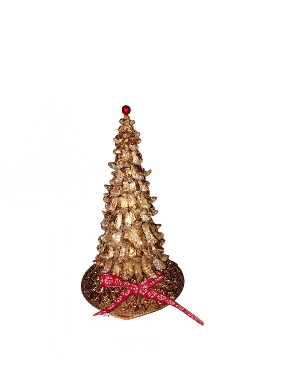 gold pine tree and red bow centerpiece