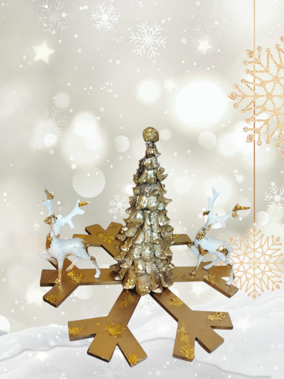 plexi glass gold snowflake with white reindeers and gold pine tree