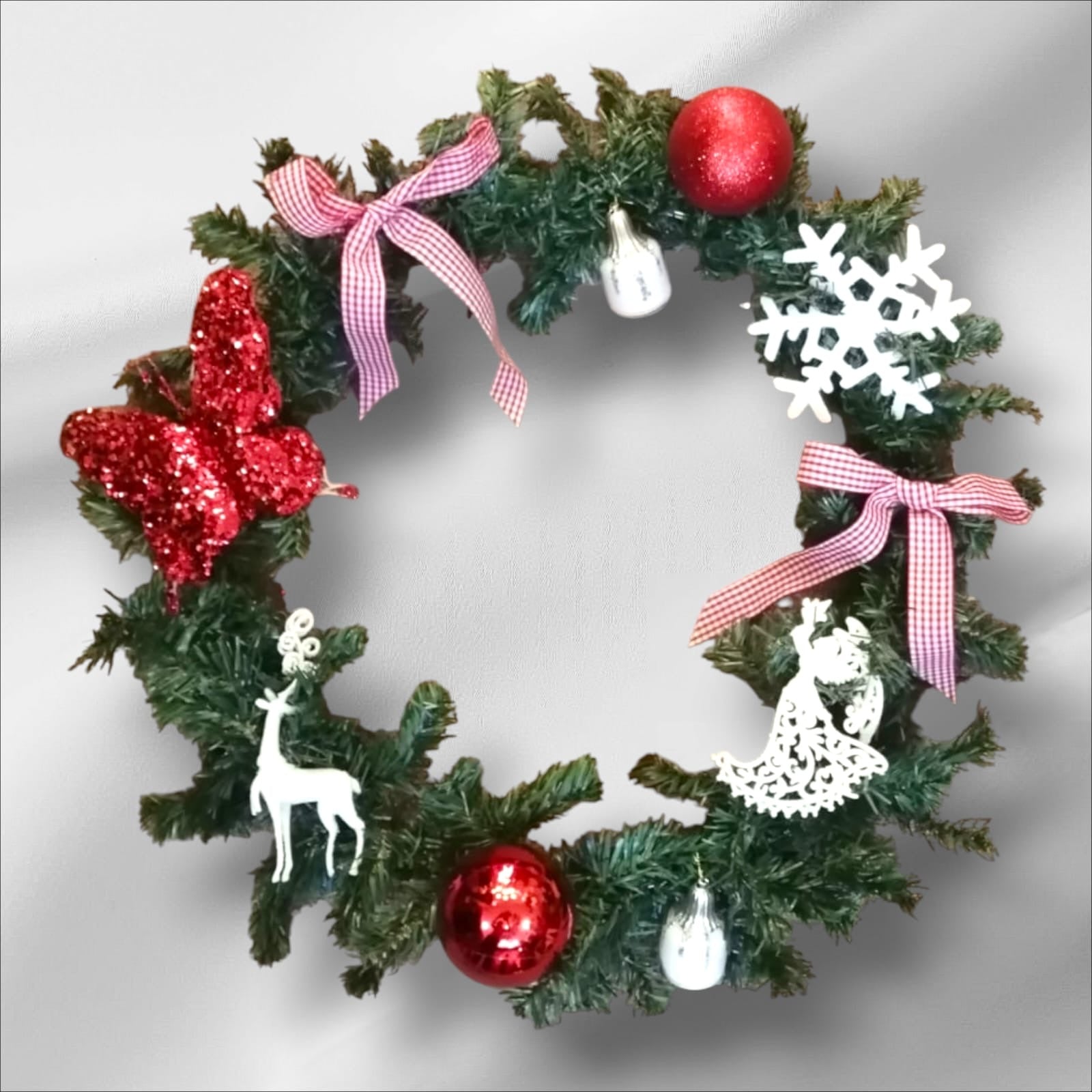 A festive blend of bright red accents and soft winter whites, creating the perfect cheerful welcome for any door or space