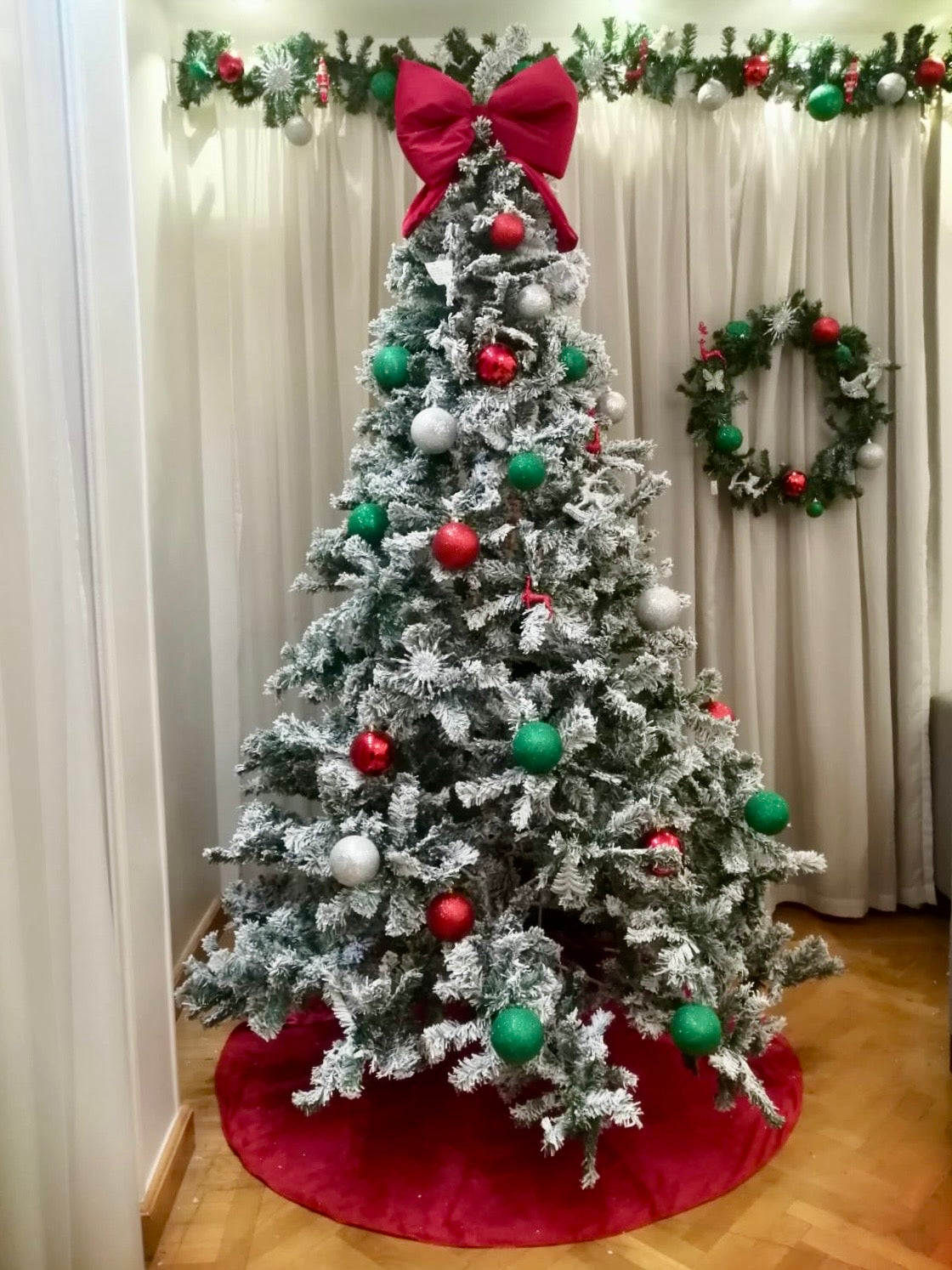 The crystal winter Bundle includes a 2.40 m green Christmas tree decorated with 30+ ornaments, paired with a 50 cm wreath, a matching garland, and a velvet tree skirt.