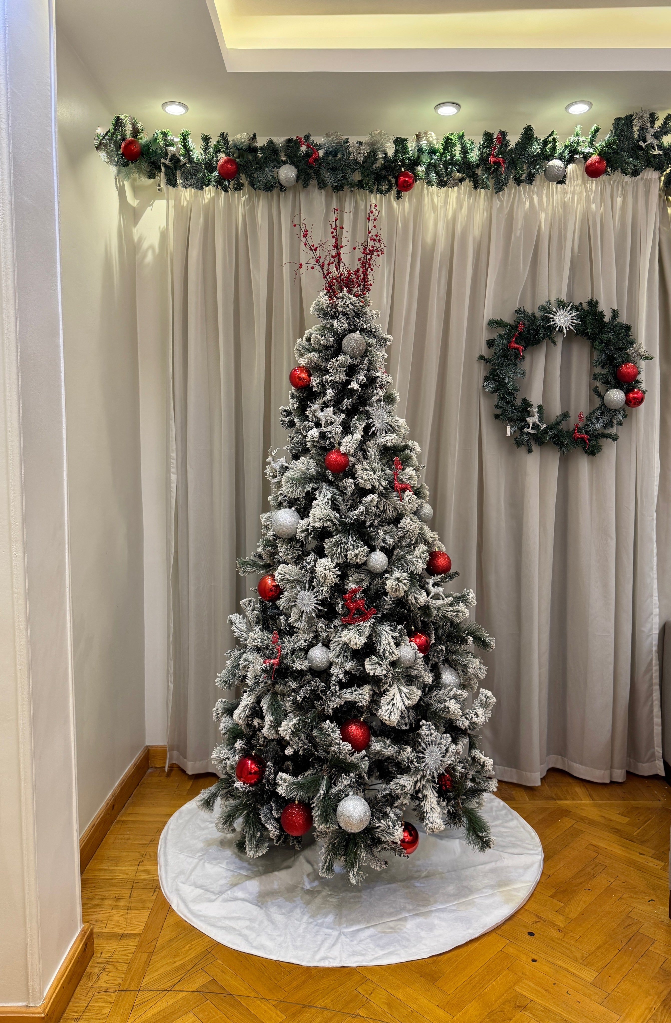 The frosted pearl Bundle includes a 2.10 m white Christmas tree with LED lights, decorated with 30+ ornaments, paired with a 50 cm wreath, a matching garland, and a velvet tree skirt.