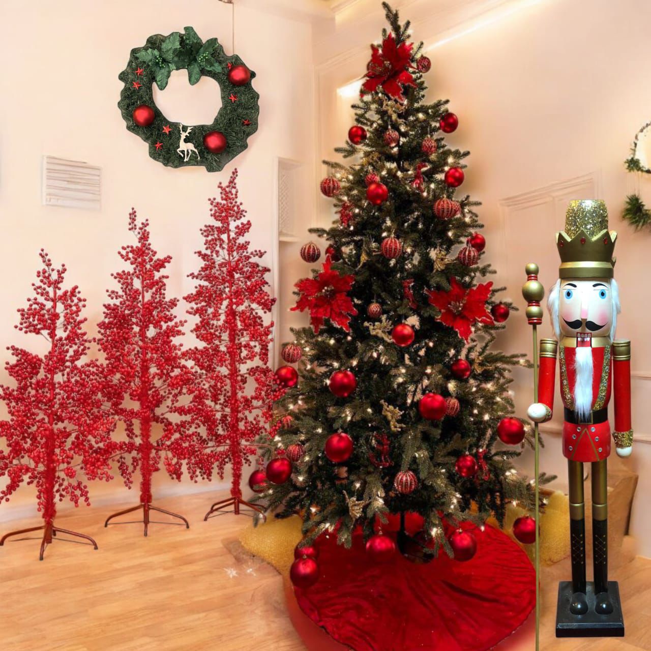 This bundle includes a 2.10 m + 30 ornaments green tree with led lights, a wreath, a nutcracker and two cherry trees. This complete bundle set instantly transforms any space and is everything you will need for your Christmas season